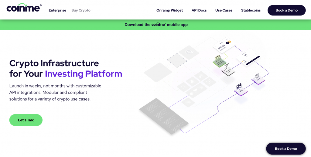 Beyond its consumer app, Coinme offers a Crypto-as-a-Service (CaaS) platform designed for fintechs, wallets, and financial institutions. This API-first infrastructure allows partners to integrate fiat-to-crypto and crypto-to-fiat functionality directly into their own products without building backend systems from scratch.