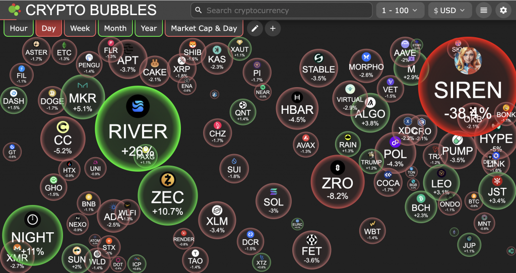 • Size: Usually represents the percentage of the price change (bigger bubble = bigger move) or the total market capitalization.