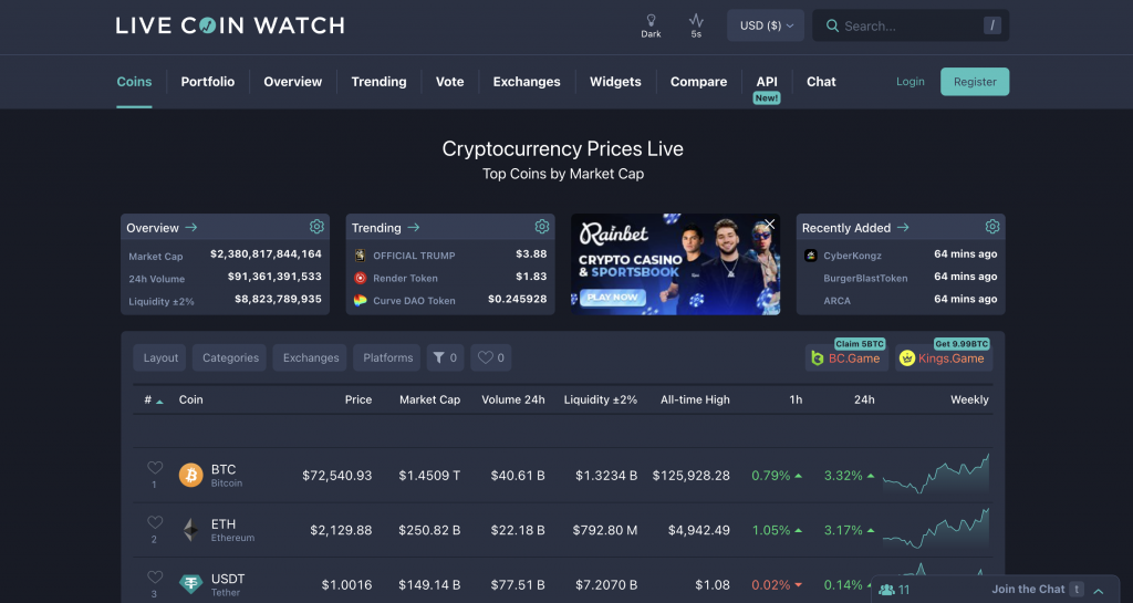 In addition to coin rankings, the platform includes dashboards that display broader market indicators, including total crypto market capitalization, 24-hour trading volume, and Bitcoin dominance. LiveCoinWatch also lists trading venues and provides exchange activity data, providing visibility into where assets are traded and how liquidity is distributed across exchanges.